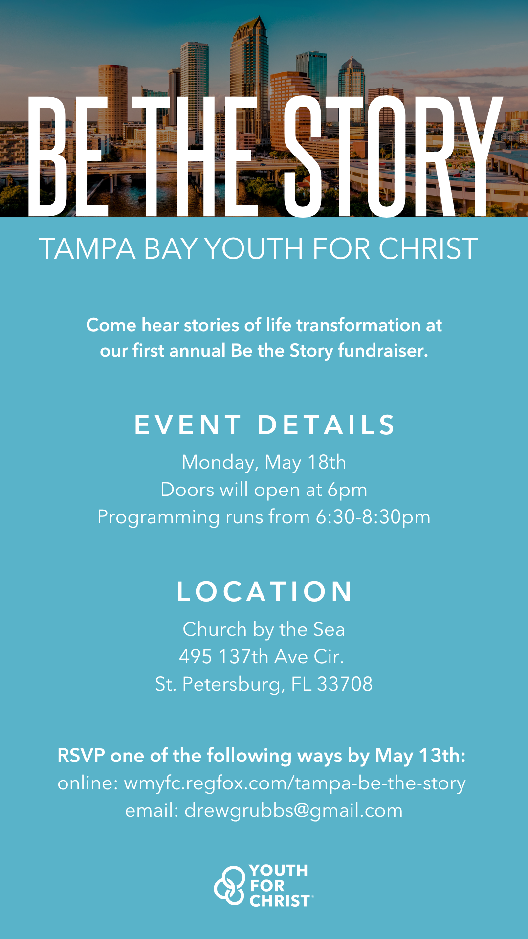We are pleased to invite you to join us for the first annual Tampa Bay Youth for Christ Be the Story on Monday, May 18, from 6:30 to 8:30pm. This evening will mark the beginning of an exciting new season of ministry in our community.